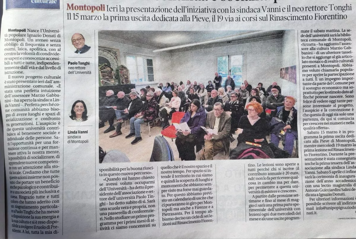 Quando mi è stato chiesto se avessi voluto occuparmi di quella che poi si è chiamata “Università Popolare”, non so perché, ma ho detto subito di sì. Forse mi attirava l’idea di poter continuare a occuparmi a livello pubblico di argomenti culturali, di poter condividere un ambiente di tipo scolastico, di fare ricerca, magari di insegnare e di imparare. Non lo so con precisione, ma si dà il fatto che ho accettato e adesso mi trovo qui a pensare e a cercare di contribuire a riempire di contenuti questa grande scatola appena formata a cui poi si è dato anche un nome altisonante: “Università Popolare Ignazio Donati di Montopoli in Val d’Arno”. La prima idea di istituirla è stata dell’Amministrazione Comunale e in particolare dell’Assessore alla Cultura. La parola “università” nella denominazione era di fatto scontata e ineludibile, perché anche in molte altre città e paesi operano analoghe associazioni con gli stessi scopi di promozione culturale e tutte si chiamano così, magari con specificazioni diverse come per esempio: “Università del Tempo Libero” o “Università della terza età”. L’aggettivo “popolare” poi per la prima volta l’ho sentito pronunciare dalla Sindaca in una delle riunioni propedeutiche prima della vera e propria istituzione e, devo dire la verità, mi è piaciuto subito. Università Popolare suonava bene e poi se si considera l’università come una scuola di élite l’aggettivo popolare comunque la fa diventare disponibile per tutti. L’intitolazione a Ignazio Donati invece la rivendico tutta per me e più ci penso e più mi sembra di averci azzeccato: Ignazio Donati è proprio la persona giusta: è un montopolese; è vissuto nell’800 e quindi ha già di per sé un’aura di nobiltà dovuta al tempo trascorso che lo fa diventare un personaggio “storico”; è stato per tanti anni al servizio della sua comunità ricoprendo più volte la carica di sindaco; è stato una persona di cultura e uno studioso della storia locale; ha anche raccolto il frutto dei suoi studi in un compendio che, con grande liberalità e senso civico, ha voluto lasciare in eredità a tutta la sua comunità e che ancora oggi si conserva nell’archivio storico del comune in un poderoso volume di più di mille pagine tutte completamente scritte a mano. L’intitolazione dell’Università a Ignazio Donati rappresenta quindi non solo il degno riconoscimento della sua opera di storico e di letterato, ma anche, per la nuova associazione, un possibile punto di partenza per ricollegarsi attraverso il suo scritto alle radici del nostro territorio. Quando, spesso, penso a come poter organizzare l’attività di questa nuova “università”, immediatamente mi viene in mente che si chiama “università” e che quindi è soprattutto una scuola, un luogo che si frequenta per “imparare” e per arricchirsi di nozioni e di capacità di sintesi. Questo vale per tutte le scuole a prescindere dall’età degli studenti. Comunque non è neppure detto, come si può pensare, che i nostri studenti debbano essere per forza tutti anziani e tutti magari pensionati, anzi speriamo proprio di no. A ogni buon conto secondo me questa nostra scuola dovrebbe avere essenzialmente due obbiettivi didattici che di fatto sono già scritti nella sua denominazione: Il primo obbiettivo è quello individuato appunto dall’aggettivo popolare, che in questo caso si deve intendere come “generale, esteso, complessivo e a disposizione di tutti”. Questa secondo me dovrebbe essere una scuola nella quale si possono recuperare, a un buon livello, nozioni di inquadramento generale su materie fondamentali come per esempio: letteratura, storia, storia dell’arte, lingua inglese, geografia, fisica. Si dovrebbero quindi istituire e svolgere su questi argomenti dei corsi di più lezioni in cui si forniscono le basi per poi affrontare, eventualmente anche in proprio, gli approfondimenti successivi. Spesso in questo tipo di “Università”, sbagliando, si danno per scontate certe conoscenze che si ritengono ormai patrimonio comune, perché magari fanno parte da sempre dei programmi delle scuole superiori, oppure si ritengono già acquisite da tutti nella nostra cultura. Questo è un atteggiamento che deriva dal fatto che si ritiene quasi di offendere il pubblico nel momento in cui si propongono nozioni e considerazioni di carattere generale. Invece frequentemente certi argomenti sono conosciuti solo “di nome”, si sa solo che esistono, anche se magari i contenuti veri e le implicazioni di correlazione ci sfuggono quasi totalmente. E allora è abbastanza inutile che in queste “università”, come spesso accade, si tengano conferenze su argomenti di nicchia e collaterali, dando per scontata e acquisita la conoscenza di base, che in effetti spesso rimane incerta e nebulosa. Per questo dico che forse, in un ambito del genere, non è affatto utile organizzare conferenze spot su argomenti particolari o “di nicchia” solo perché magari abbiamo a disposizione il relatore di grido, ma che è più produttivo scegliere per un certo periodo un unico argomento da affrontare e capire nei suoi reali contenuti e anche da più punti di vista. Credo che sia meglio, sia pure con relatori diversi, anche meno noti, ma più disponibili, in luogo di singole conferenze, organizzare dei veri e propri corsi “universitari” di base su argomenti di interesse abbastanza generale. Il secondo obbiettivo è quello indicato proprio dall’intitolazione dell’università a Ignazio Donati e questo è un obbiettivo di studio e di ricerca finalizzato alla conoscenza del nostro territorio di riferimento sotto ogni profilo: storico, geografico, sociologico, paesaggistico, folcloristico e tradizionale, proprio come ha cercato di fare lui nel testo che ci ha lasciato. E anche qui penso che si dovrà partire dal basso, senza dare per scontato, che tutti conoscano tutti gli aspetti del territorio in cui vivono, Anzi s