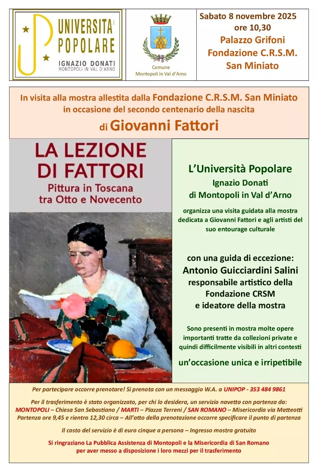 In occasione del secondo centenario della nascita di Giovanni Fattori, l'Università Popolare “Ignazio Donati” di Montopoli in Val d'Arno organizza una visita guidata alla mostra “La lezione di Fattori. Pittura in Toscana tra Otto e Novecento”, allestita presso Palazzo Grifoni – Fondazione C.R.S.M. di San Miniato.
