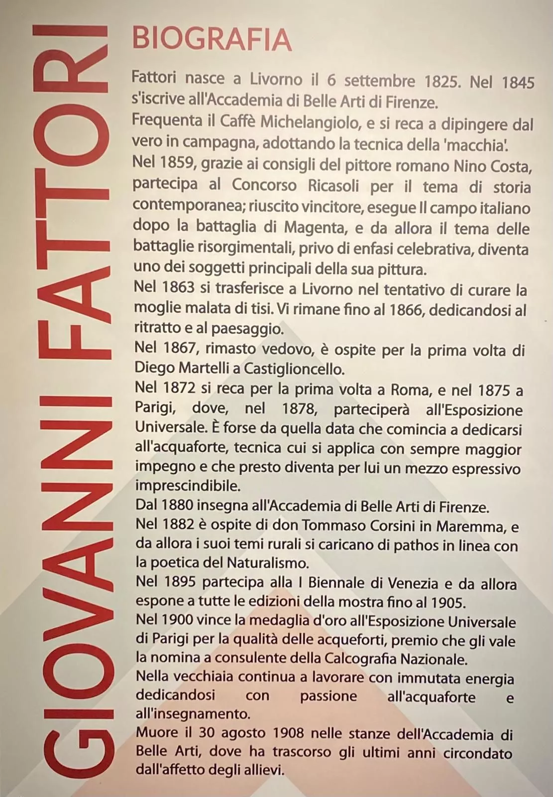 L'esposizione presenta numerose opere di grande rilievo, molte delle quali provenienti da collezioni private, raramente visibili al pubblico, offrendo così un'occasione unica per approfondire la figura di Giovanni Fattori e l'evoluzione della pittura toscana tra Ottocento e Novecento.